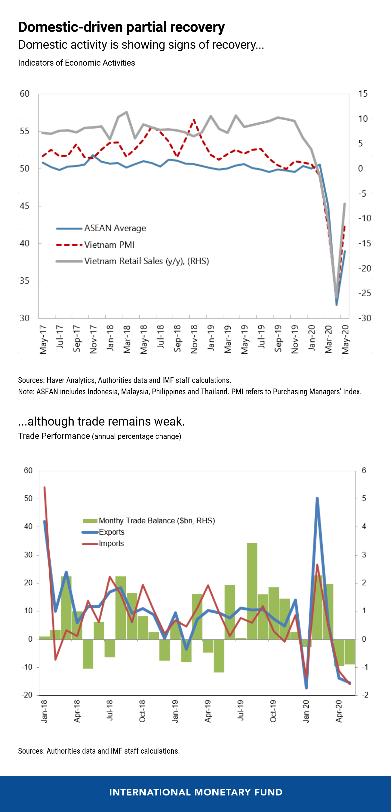 However, the economic impact is expected to be milder than most countries in the region. Prospects for a recovery look bright as lockdown measures have been lifted, businesses resume operations, and consumers flock to restaurants and shops. There are tentative signs of a domestic recovery, with retail sales and industrial production rebounding from low points seen during the lockdown. But sustained and robust growth will also require an economic recovery among Vietnam’s trading partners.