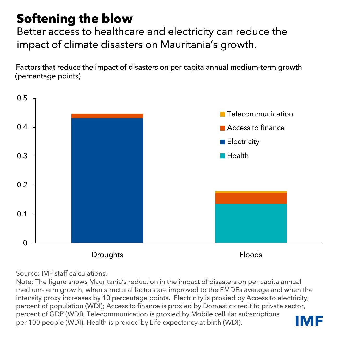 The cost to Mauritania’s growth is significant as a result. Our research shows that on average Mauritania’s medium-term annual per capita growth could fall by around 0.8 to 1 percentage points if a drought intensifies by 10 percentage points. The rate of intense droughts is measured over 5-year windows, based on the impact on more than 0.01 percent of the population. If a flood intensifies by the same amount, the hit to medium-term growth would be around one-fifth to one-fourth of the drought-related effect on per capita growth.