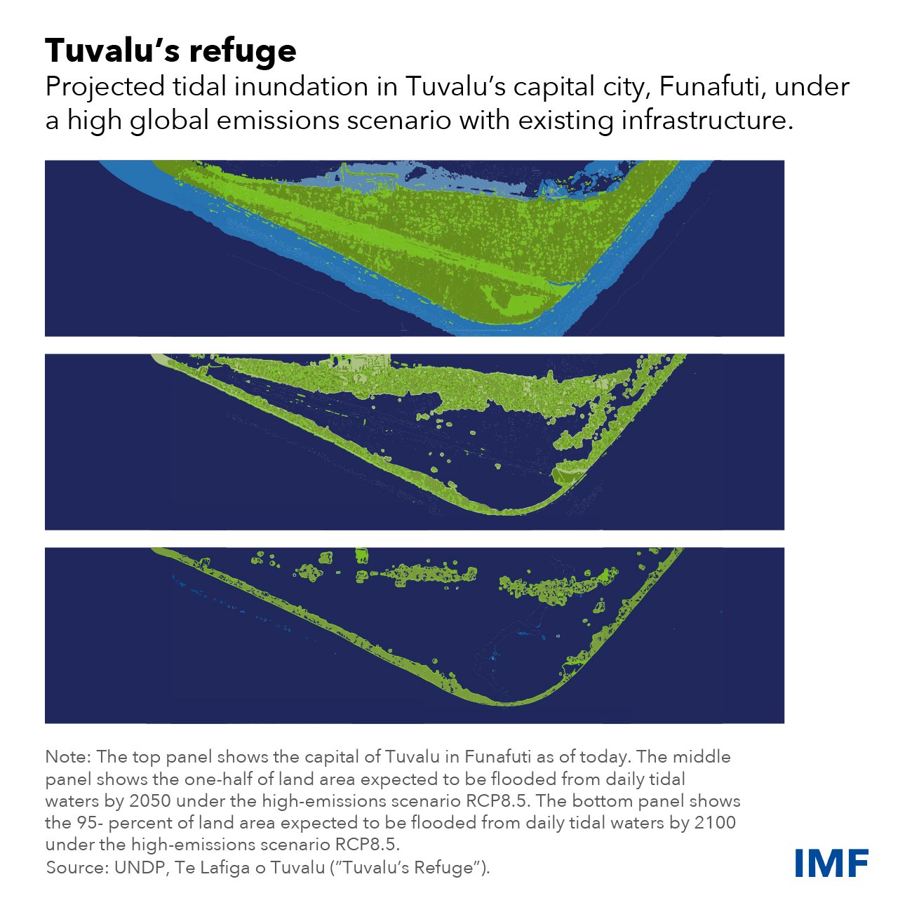 But while domestic policies can go a long way in fostering growth in coming years, Tuvalu’s long-term prospects also depend on the world’s collective ability to prevent destructive global warming scenarios. This is because under a high global emissions scenario and with its existing infrastructure, the country may become uninhabitable by the end of this century as a result of rising sea levels.
