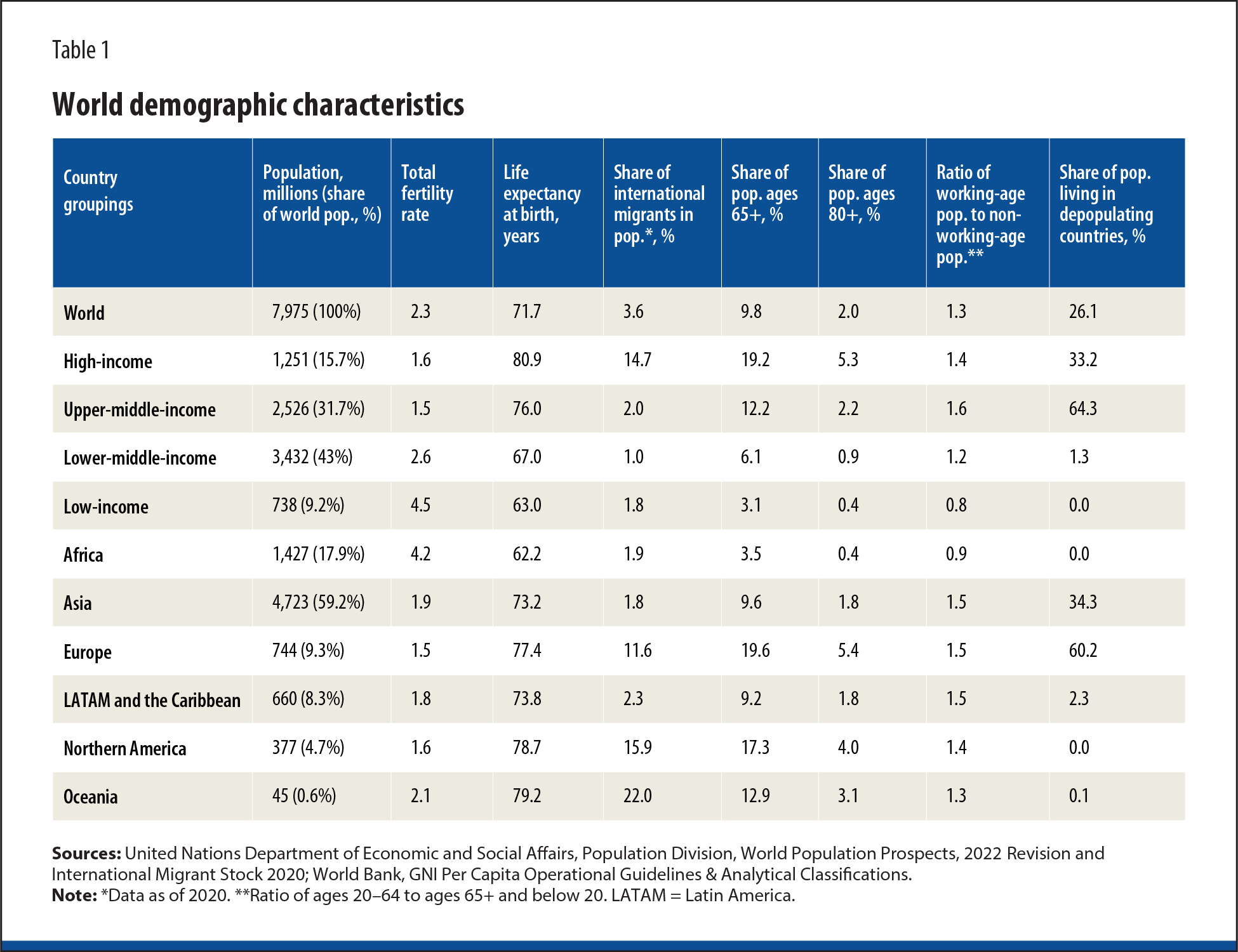 Population growth rates vary considerably across countries, income groups, and geographic regions. Growth is disproportionately high among low-income countries and in Africa and disproportionately low among middle- and (especially) high-income countries and in Europe. What is fast becoming universal is that population aging is the most pervasive and dominant global demographic trend, owing to declining fertility, increasing longevity, and the progression of large cohorts into older ages.