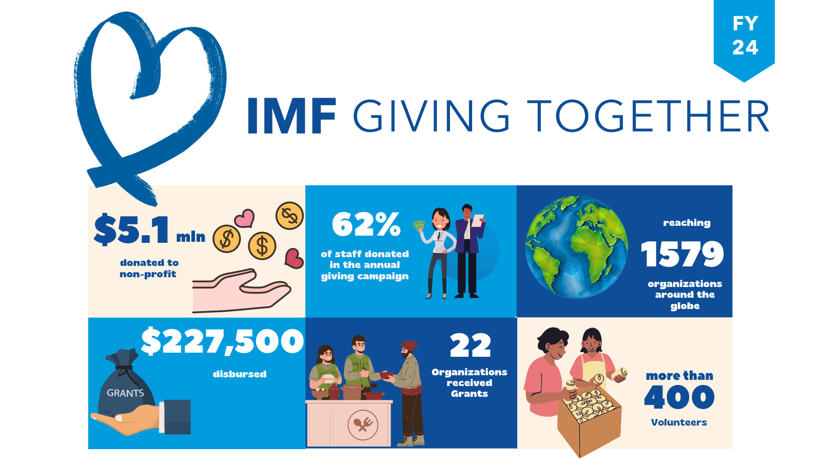 Giving Together is the IMF’s philanthropic program supported by employees, retirees, and the Fund’s corporate giving initiatives. With impact on both a local and global level, the program raises funds for disaster relief, organizes staff volunteering, awards charitable grants, and runs the IMF’s annual Giving Campaign. Fiscal year 2024 was one of the program’s biggest years, with donations to nonprofits totaling US$ 5.1 million.