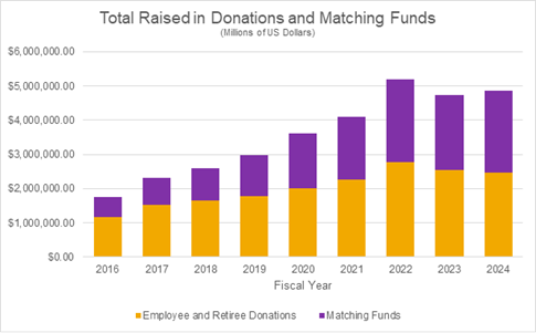 In donations and matching funds to support charitable causes in Fiscal Year 2024