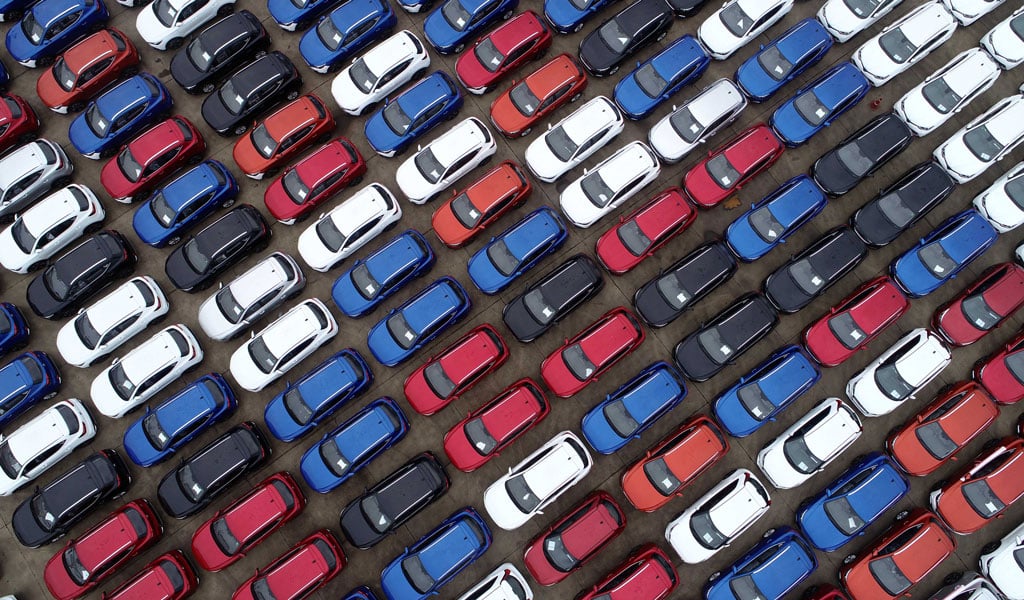 Cars to be shipped abroad, Jiangsu, China: trade tariffs have gone into effect and export orders have decreased (photo: Imagine China/Newscom) [/caption]
