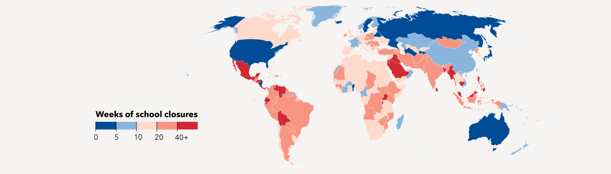 The Chart of the Week shows the duration of disrupted classroom time for those from ages 5 to 19, who make up about a quarter of the world’s population. Today, more than two years into the crisis, schools remain closed for millions worldwide—with many more shuttered again by the highly transmissible Omicron variant.