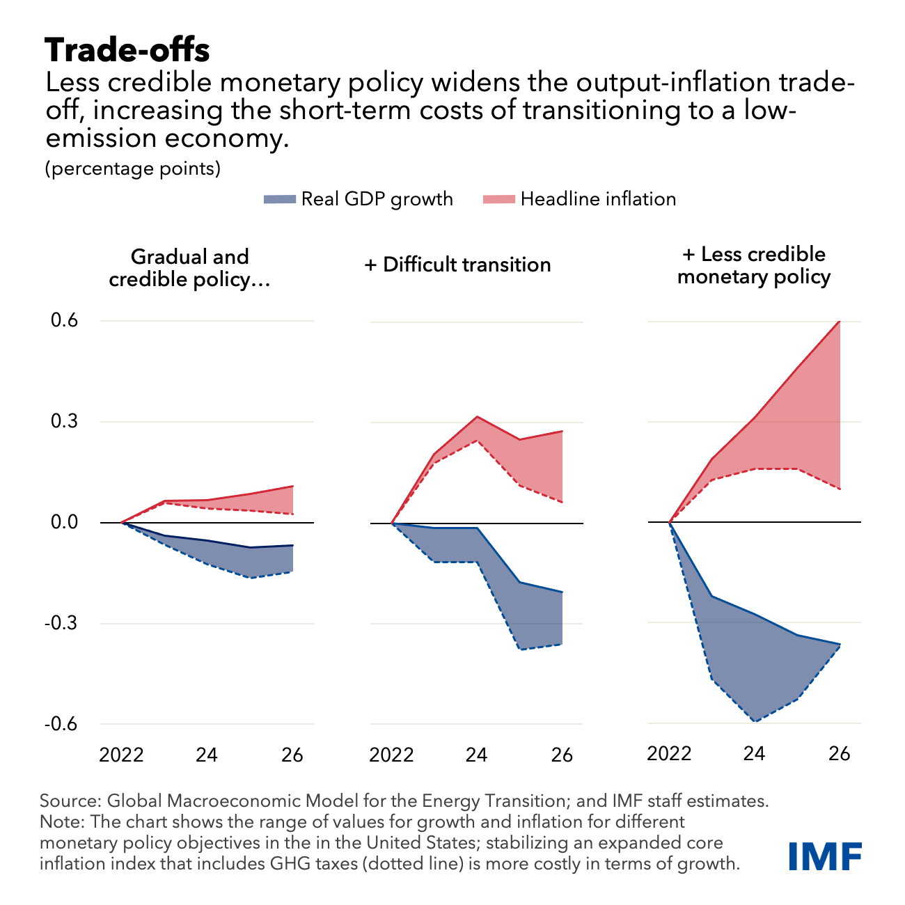 In most regions, inflation increases moderately, from 0.1 percentage point to 0.4 percentage point. To curb the costs, climate policies must be gradual. But to be most effective, they also need to be credible. If climate policies are only partially credible, firms and households will not consider future tax increases when planning investment decisions.