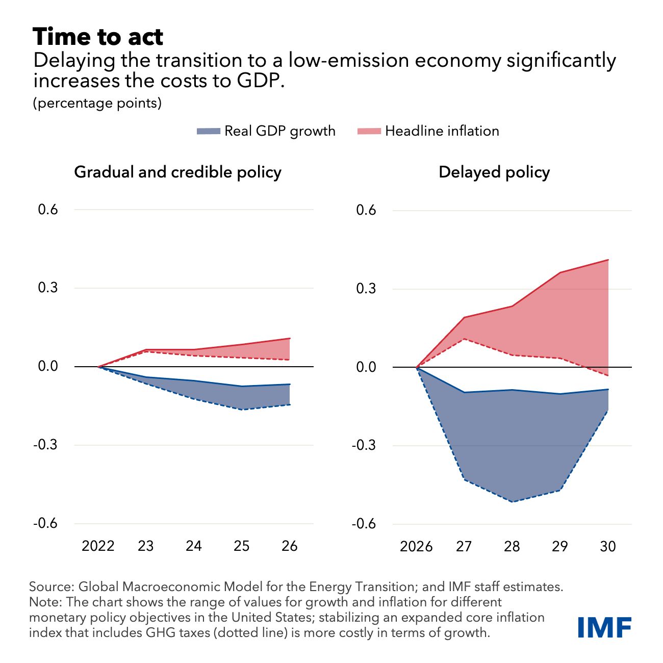 In our latest World Economic Outlook, we estimate the near-term impact of different climate mitigation policies on output and inflation. If the right measures are implemented immediately and phased in over the next eight years, the costs will be small. However, if the transition to renewables is delayed, the costs will be much greater.