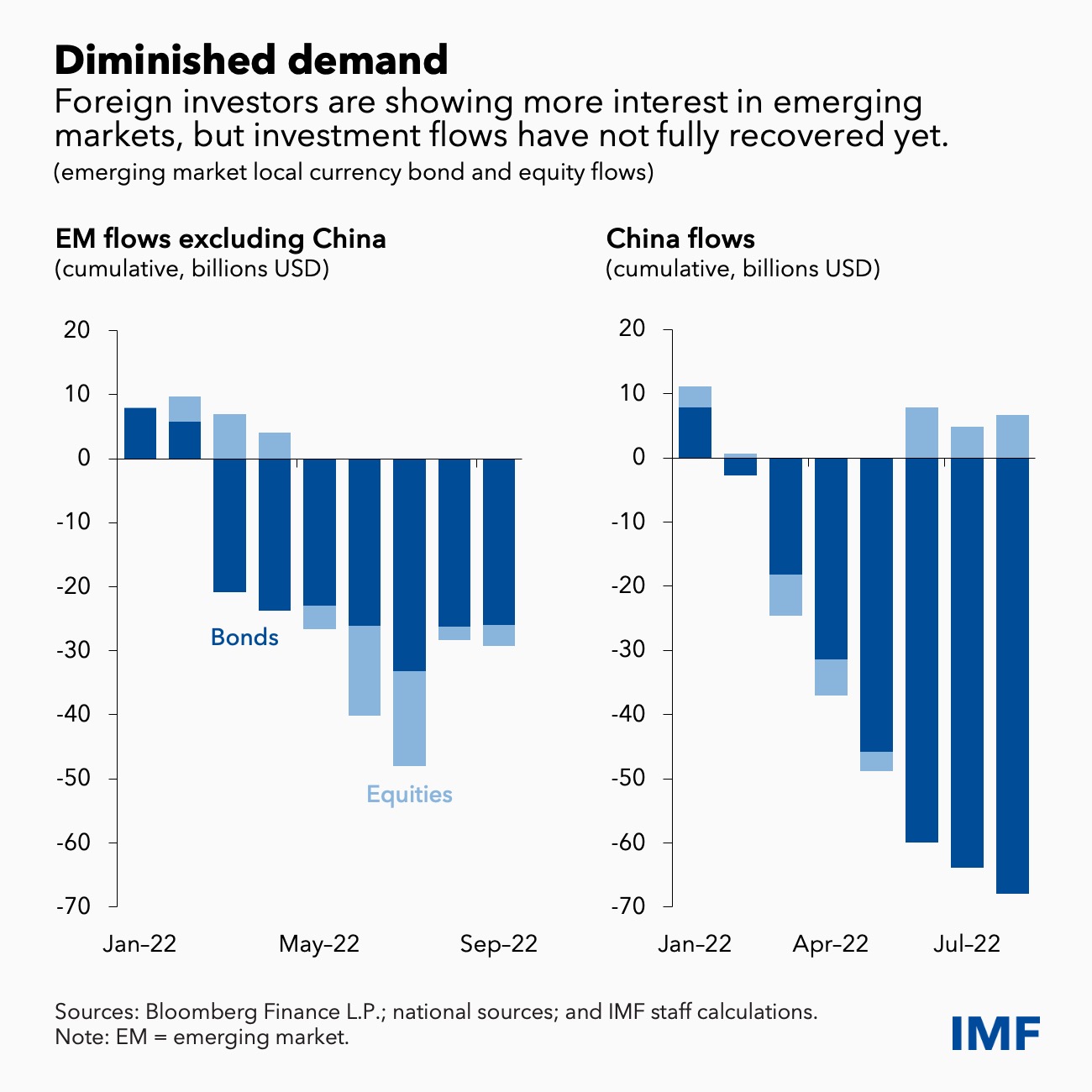 Investors have so far continued to differentiate across emerging economies. While many frontier markets are at risk of sovereign default, many of the largest emerging markets are more resilient to external vulnerabilities to date. Having said that, after the stabilization of outflows in the first half of the year, foreign investors are again pulling back.