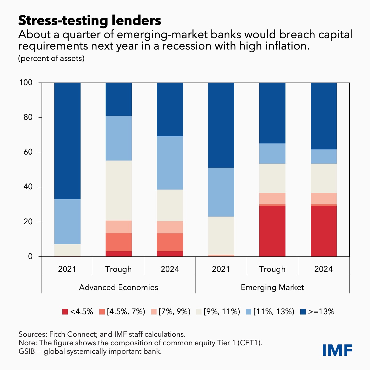The global banking sector has been bolstered by high levels of capital and ample liquidity buffers. However, the IMF’s Global Bank Stress Test warns these buffers may not be enough for some banks. In the event a sharp tightening of financial conditions causes a global recession next year amid high inflation, 29 percent of emerging-market banks (by assets) would breach capital requirements. Most banks in advanced economies would fare much better, the stress test indicates.