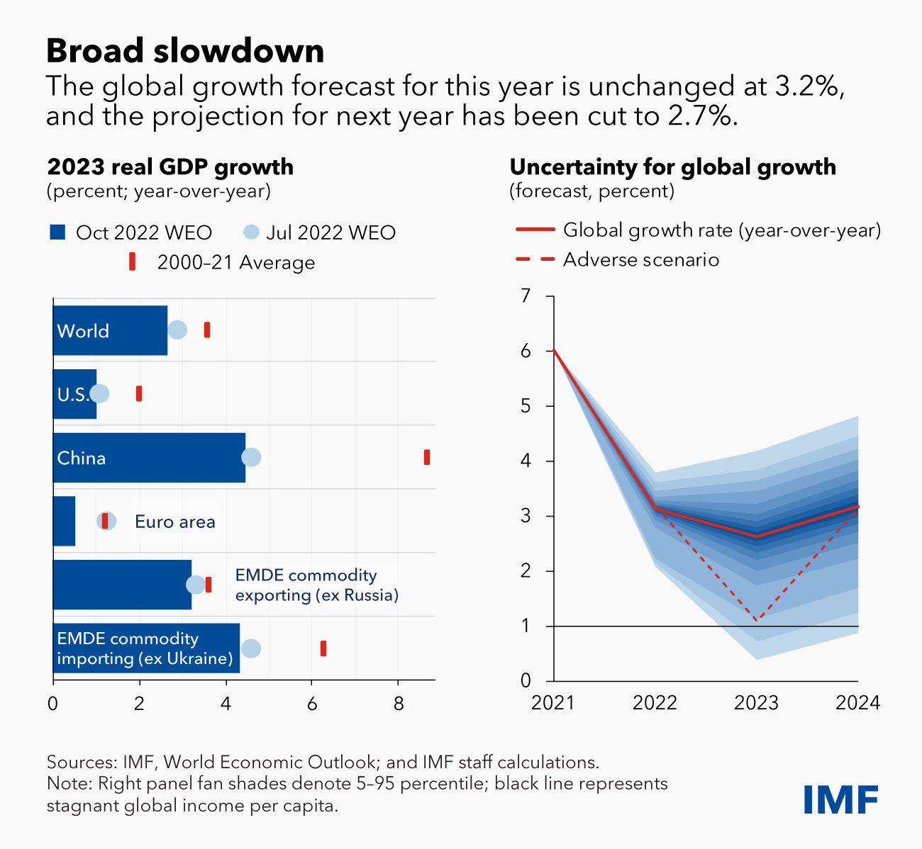 Our global growth forecast for this year is unchanged at 3.2 percent, while our projection for next year is lowered to 2.7 percent—0.2 percentage points lower than the July forecast. The 2023 slowdown will be broad-based, with countries accounting for about one-third of the global economy poised to contract this year or next. The three largest economies, the United States, China, and the euro area will continue to stall. Overall, this year’s shocks will re-open economic wounds that were only partially healed post-pandemic. In short, the worst is yet to come and, for many people, 2023 will feel like a recession.