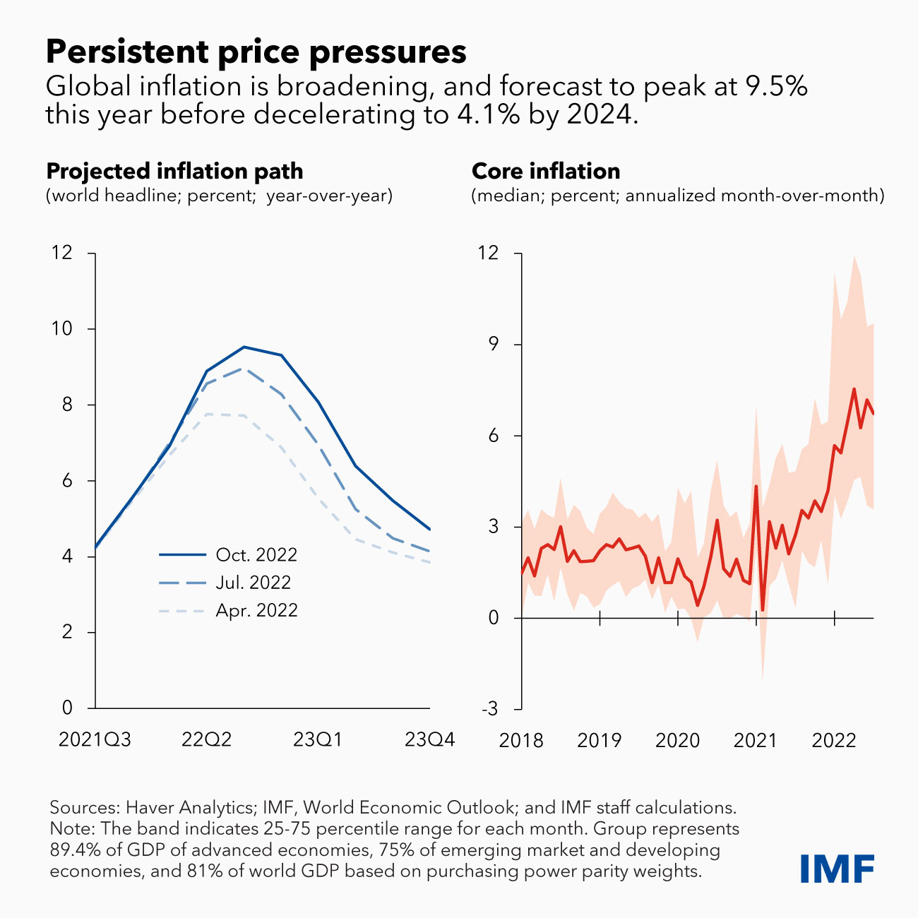 Despite the economic slowdown, inflation pressures are proving broader and more persistent than anticipated. Global inflation is now expected to peak at 9.5 percent this year before decelerating to 4.1 percent by 2024. Inflation is also broadening well beyond food and energy. Global core inflation rose from an annualized monthly rate of 4.2 percent at end-2021 to 6.7 percent in July for the median country.