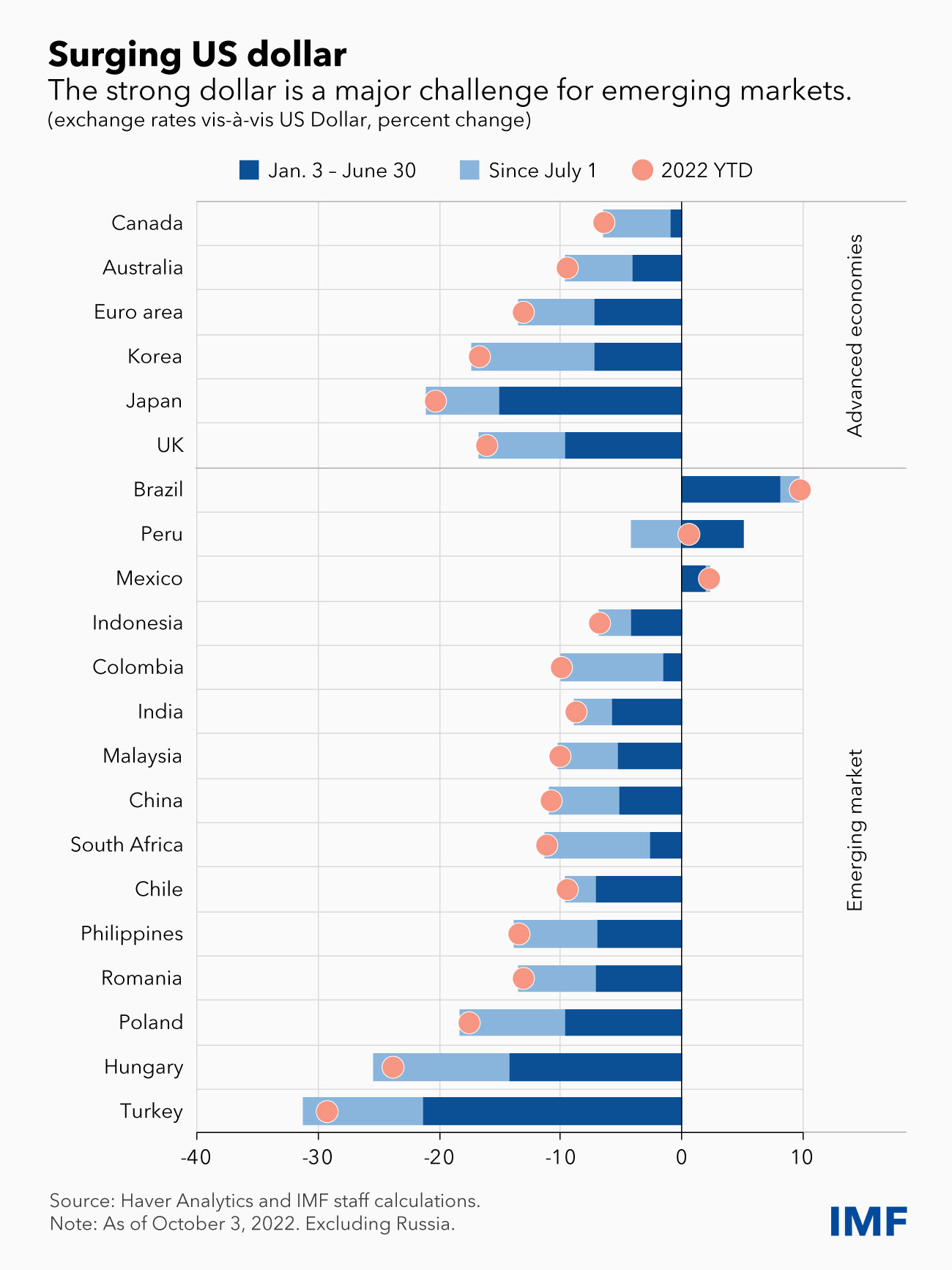 For many emerging markets, the strength of the dollar is a major challenge. The dollar is now at its strongest since the early 2000s, although the appreciation is most pronounced against currencies of advanced economies. So far, the rise appears mostly driven by fundamental forces such as tightening US monetary policy and the energy crisis.