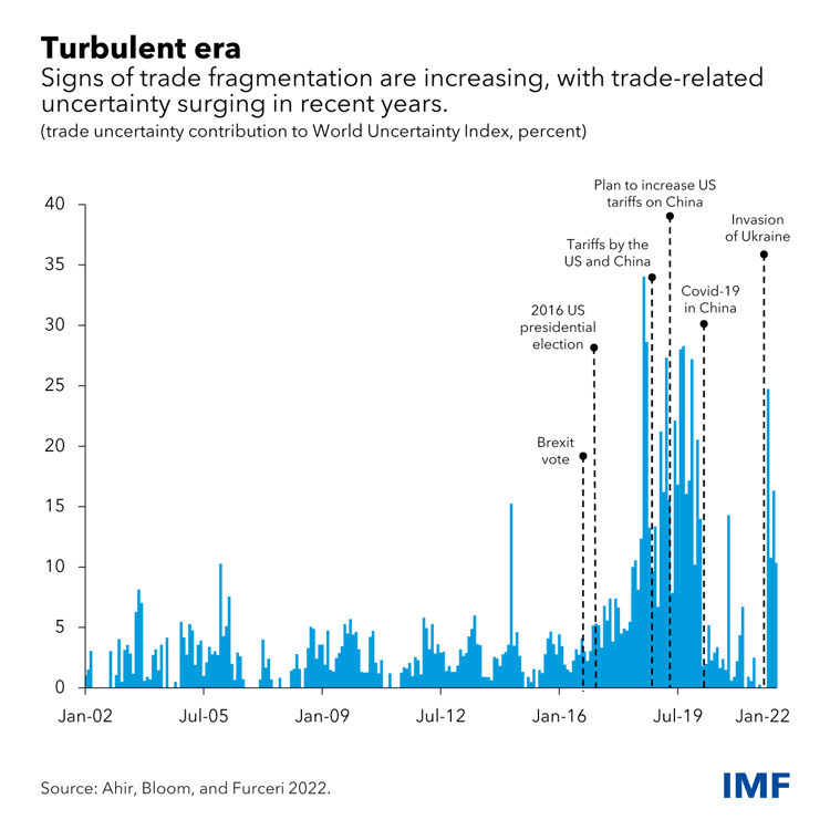 One such sign of fragmentation pressures comes from measures of trade-policy uncertainty. This measure spiked in 2018 amid tensions between the United States and China, which have increased again amid Russia’s invasion of Ukraine as sanctions on Russia created uncertainty around future trade relations.