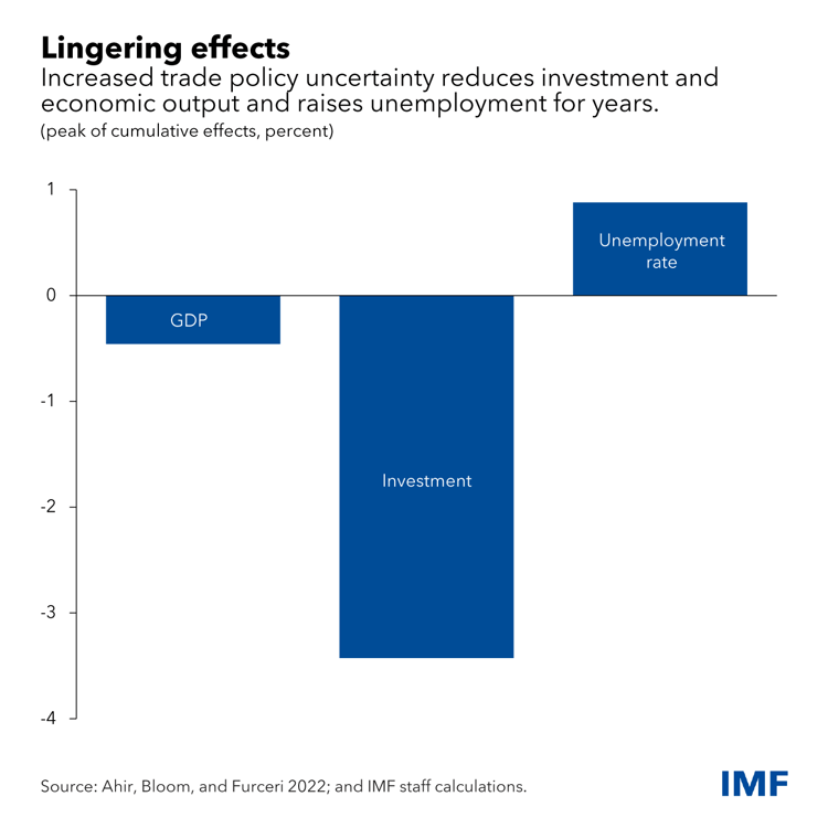 Our analysis shows that a typical shock to trade policy uncertainty, like the 2018 buildup of US-China tensions, reduces investment by about 3.5 percent after two years. It also decreases gross domestic product by 0.4 percent and raises the unemployment rate by 1 percentage point. Not everyone is equally vulnerable, however.