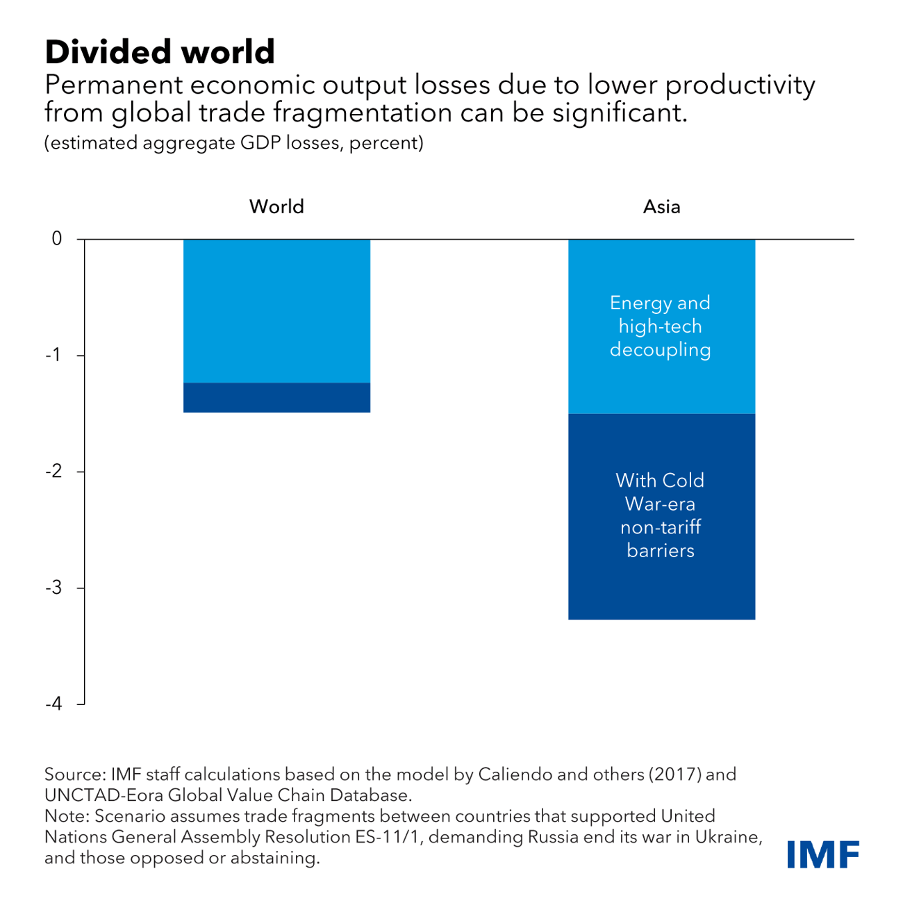 If only Russia is isolated from countries which voted in favor, output losses for the world economy are small. However, losses become significantly larger under more adverse scenarios such as where the world divides into two blocs, with trade restricted between countries in favor and those against or abstaining. Permanent global annual losses are estimated at 1.5 percent of GDP, with larger losses in Asia and Pacific countries at over 3 percent of GDP, reflecting the key role trade plays in the region. Losses are larger in countries where trade with the other bloc is significant, due to a loss of export markets and splintering of complex production networks.