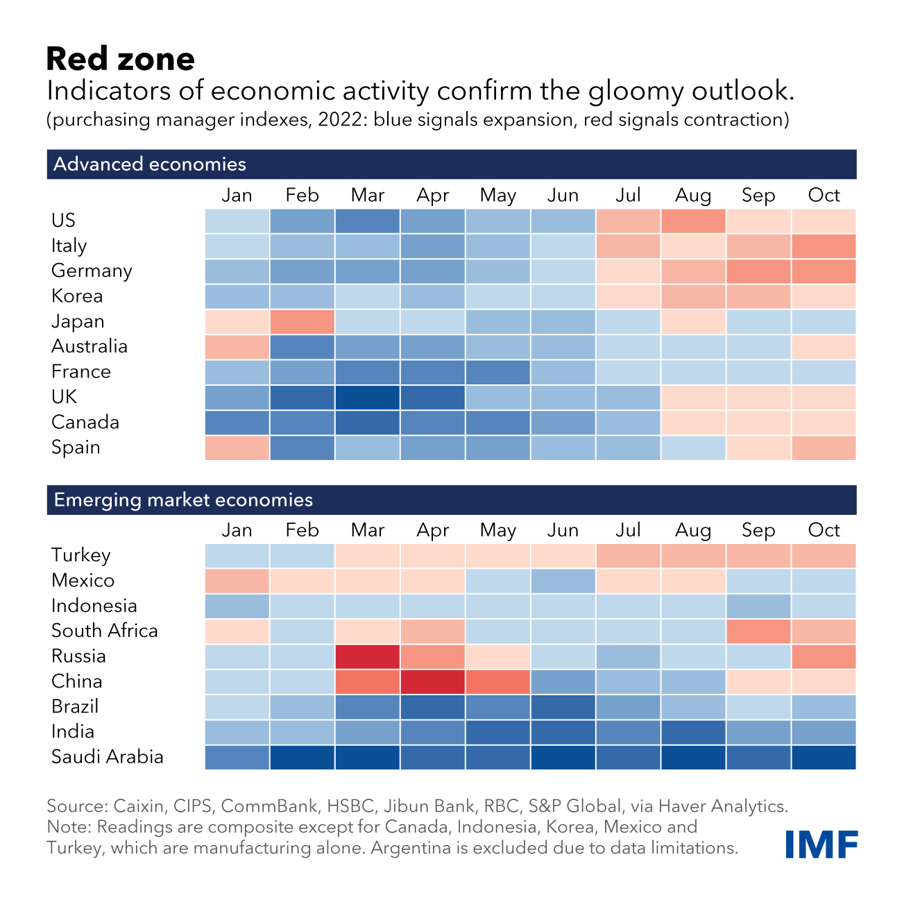 As the chart illustrates, readings for a growing share of G20 countries have fallen from expansionary territory earlier this year to levels that signal contraction. That is true for both advanced and emerging market economies, underscoring the slowdown’s global nature.