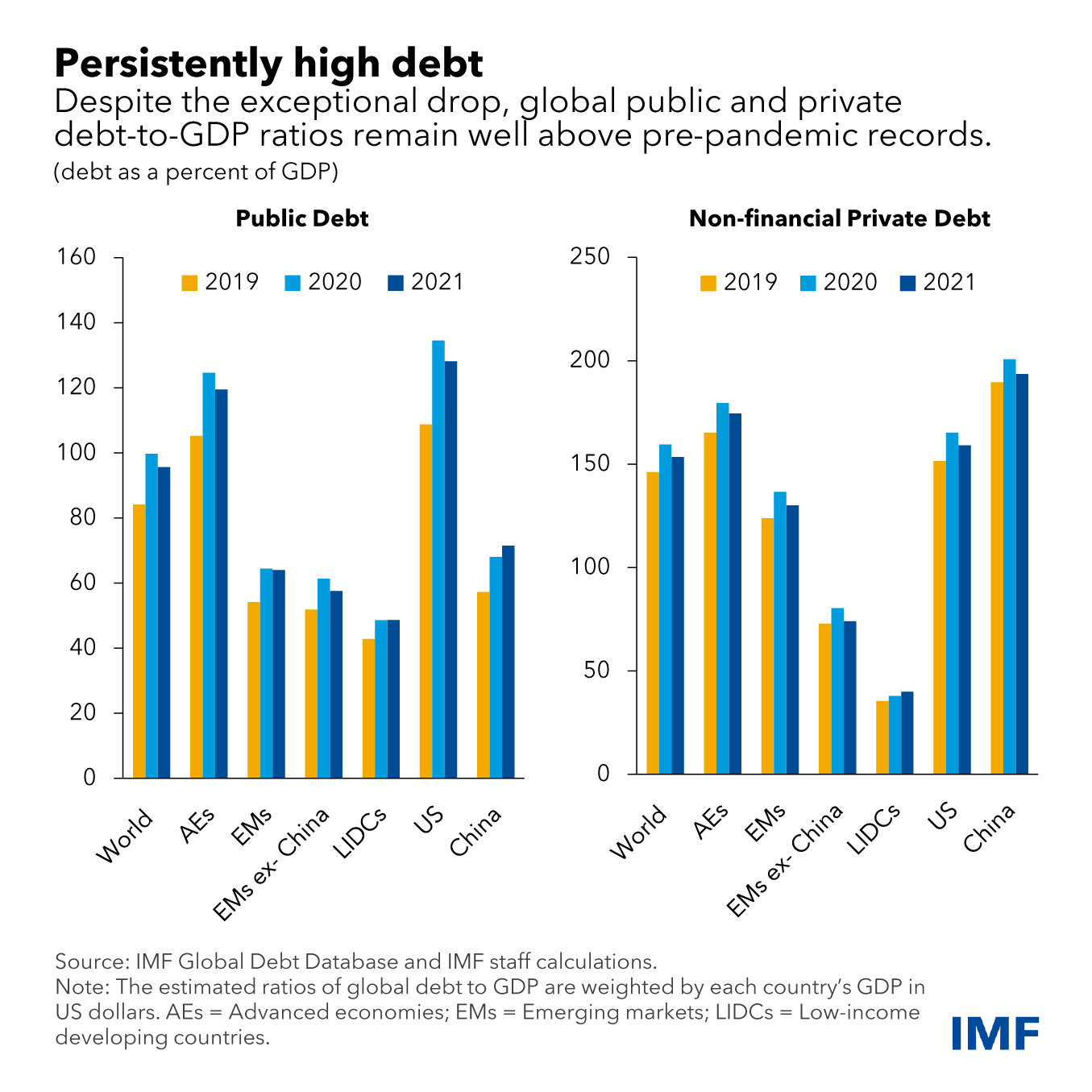 Global debt remained above pre-pandemic levels in 2021 even after posting the steepest decline in 70 years, underscoring the challenges for policymakers.