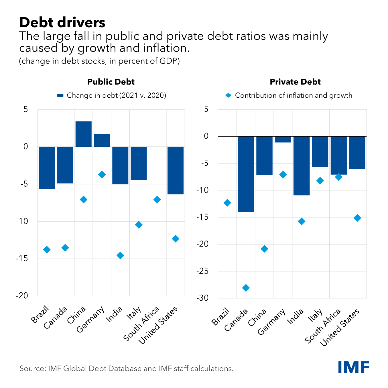 The fall in debt was largest in advanced economies, where both private and public debt fell by 5 percent of GDP in 2021, reversing almost one-third of the surge recorded in 2020.