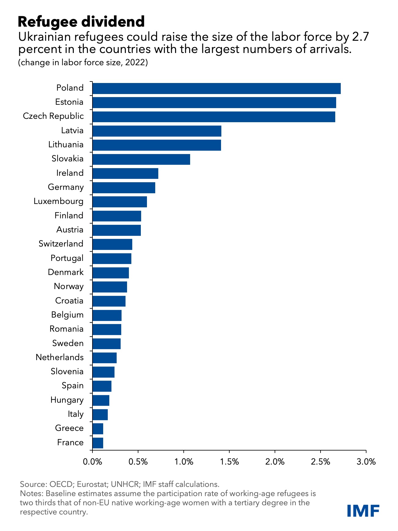 Supporting refugees comes with some short-term fiscal costs. Across the EU, these could reach 30 billion euros to 37 billion euros in the first year, or about 0.2 percent of gross domestic product, as we noted in our latest Regional Economic Outlook, published in October. Countries with the largest shares of refugees, including the Czech Republic, Estonia, Moldova, and Poland, could incur fiscal costs this year equal to about 1 percent of GDP. The larger share of women and children will result in more spending on childcare, education, and health care services.