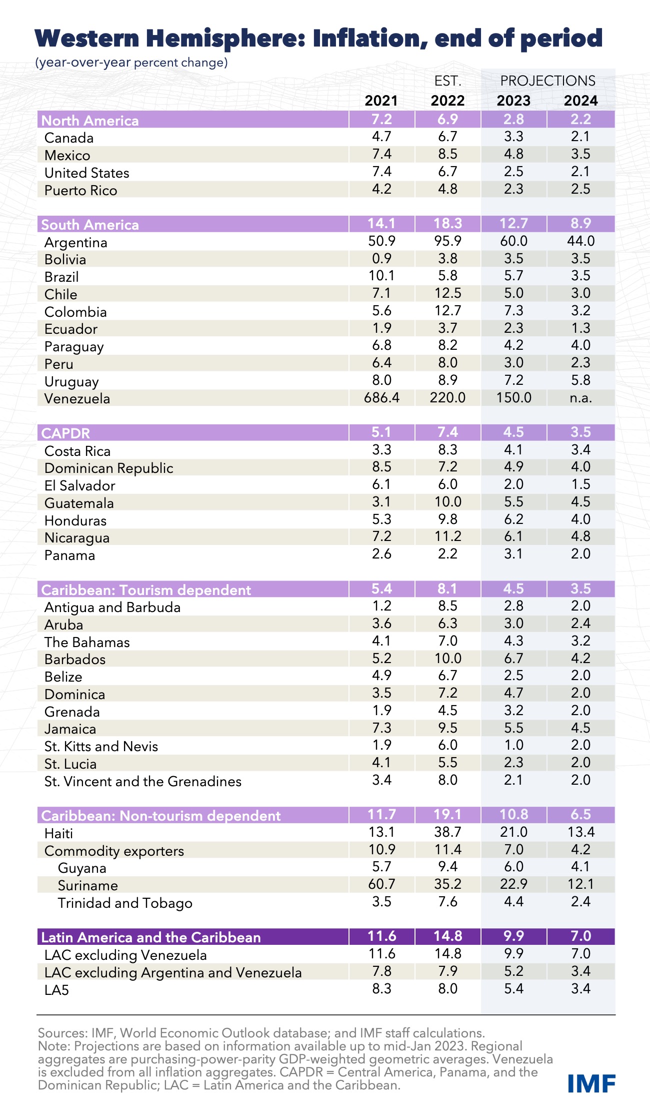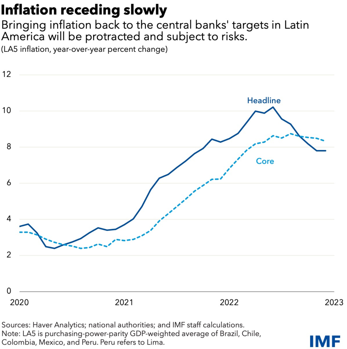 Inflationary pressures are receding in many countries due to the early and determined efforts of central banks as well as lower global prices of food and energy. However, core inflation (that is, excluding food and energy), remains high at around 8 percent in Brazil, Mexico, and Chile (and somewhat higher in Colombia but lower in Peru).