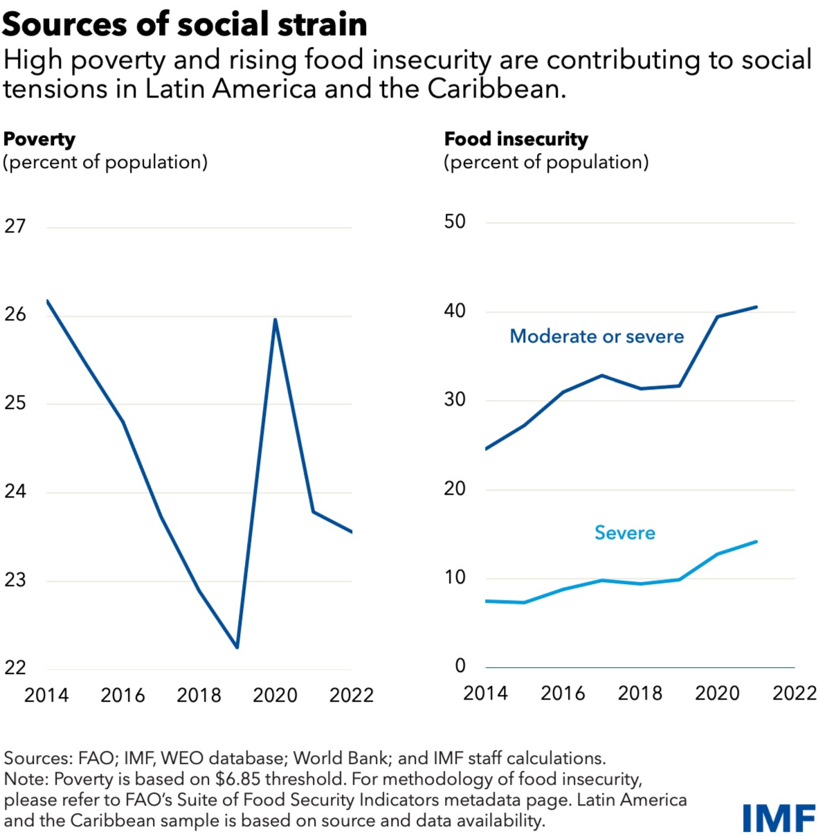 Growing social discontent and diminished trust in public institutions has been an important trend in the region for some time. Social tensions were certainly exacerbated during the pandemic. Poorer people—particularly those employed in in-person services—bore the brunt of the economic fallout. While government support helped, many were unable to fully insulate themselves from the negative impact, as shown by the noticeable increase in poverty. Increased food insecurity is also a key symptom of the lasting socioeconomic effects of the pandemic.