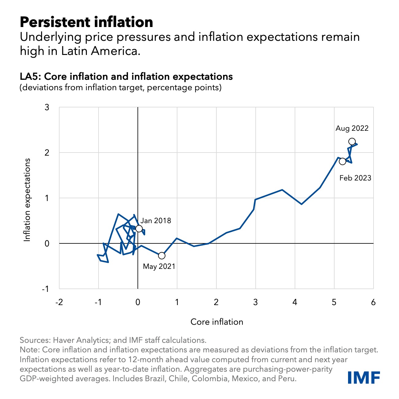 After peaking at 10 percent in mid-2022, headline inflation in the largest Latin American economies has slowed to 7 percent in March. However, this drop mostly reflects the fall of commodity prices from their peaks. Progress in bringing down core inflation, which excludes food and energy, appears to have stalled. Labor markets are tight, with employment firmly above its pre-pandemic levels. At the same time, output is at or above potential, and short-term inflation expectations exceed central banks’ target ranges. Strong domestic demand, rapid wage increases, and broad-based price pressures all point to a risk that inflation in the region could remain unacceptably high.