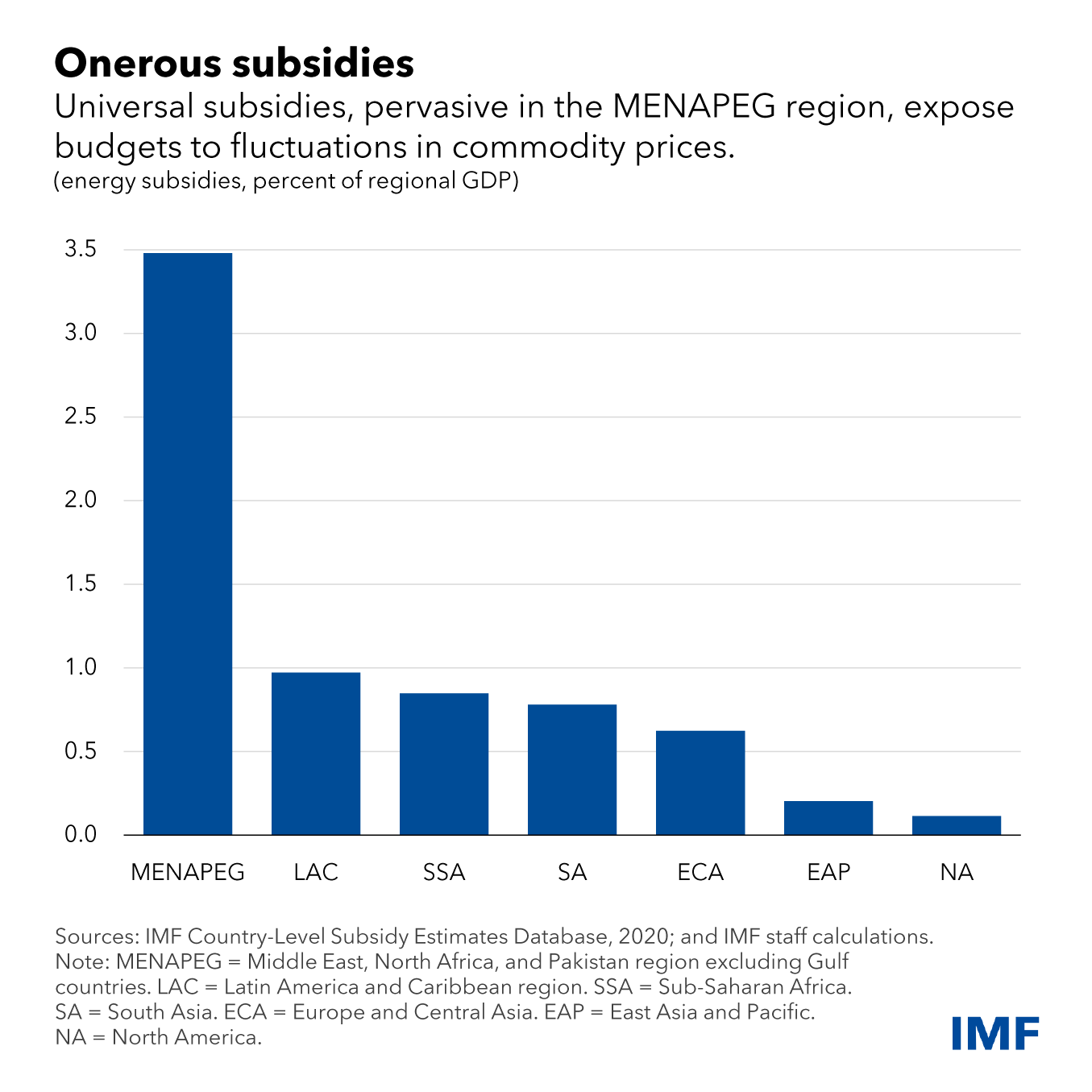 There are multiple factors behind the region’s relatively high exposure to fiscal risks. First is that economic growth is more volatile than in other parts of the world. High reliance on resource revenue among hydrocarbon exporters such as Algeria, Iraq, and Libya, and pervasive universal energy and food subsidies across the region have also exposed budgets to fluctuations in commodity prices.
