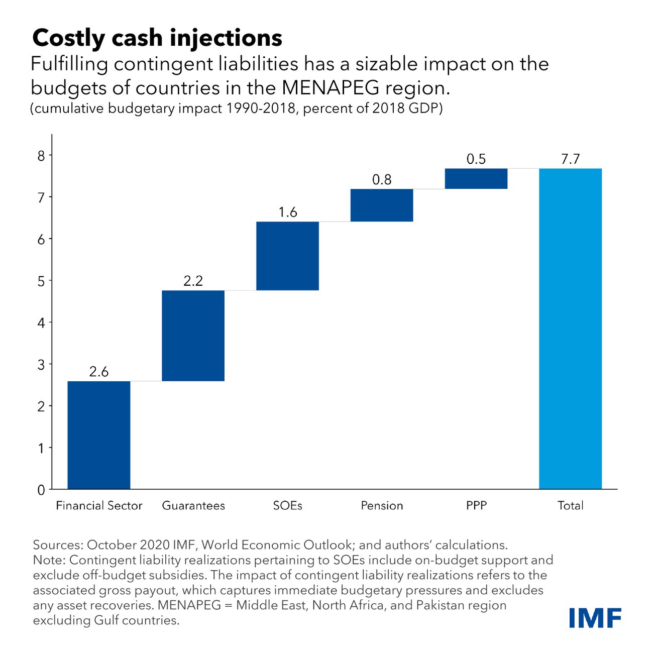 Second, state ownership of non-financial corporations and banks in these countries can generate sizable government obligations that can come due when negative events occur, known as contingent liabilities. For example, a public electric or water utility company that faces large operational losses might require government financial assistance to continue providing services.