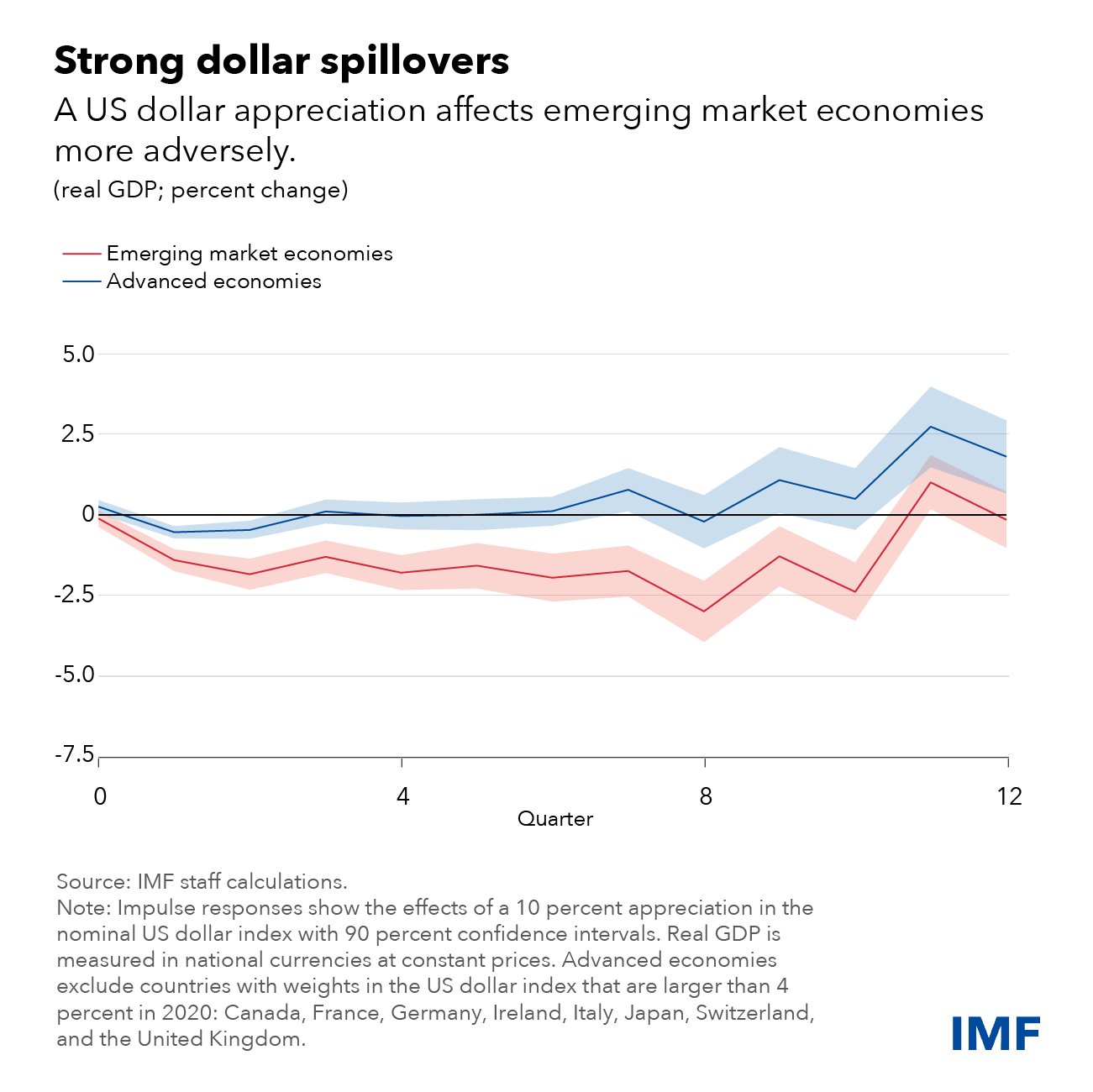 In emerging market economies, the effects of the strong dollar spread via trade and financial channels. Their real trade volumes decline more sharply, with imports dropping twice as much as exports. Emerging market economies also tend to suffer disproportionately across other key metrics: worsening credit availability, diminished capital inflows, tighter monetary policy on impact, and bigger stock-market declines.
