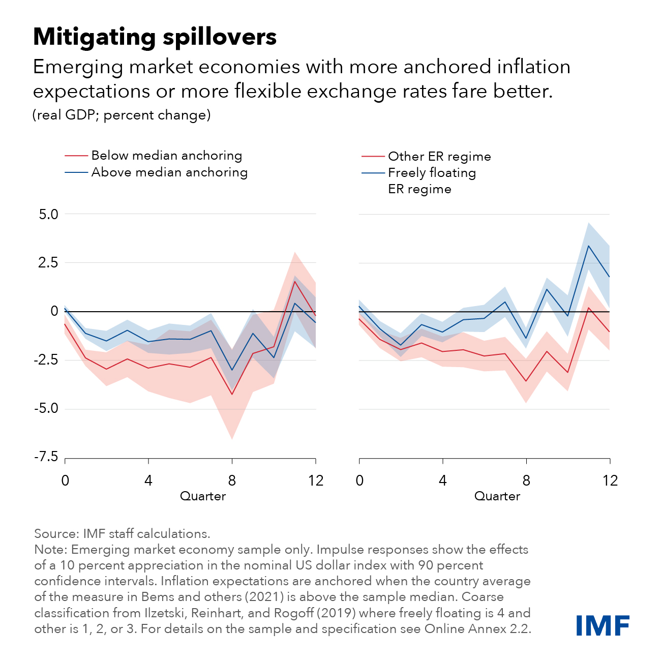 Emerging market economies with more anchored inflation expectations or more flexible exchange rate regimes fare better.