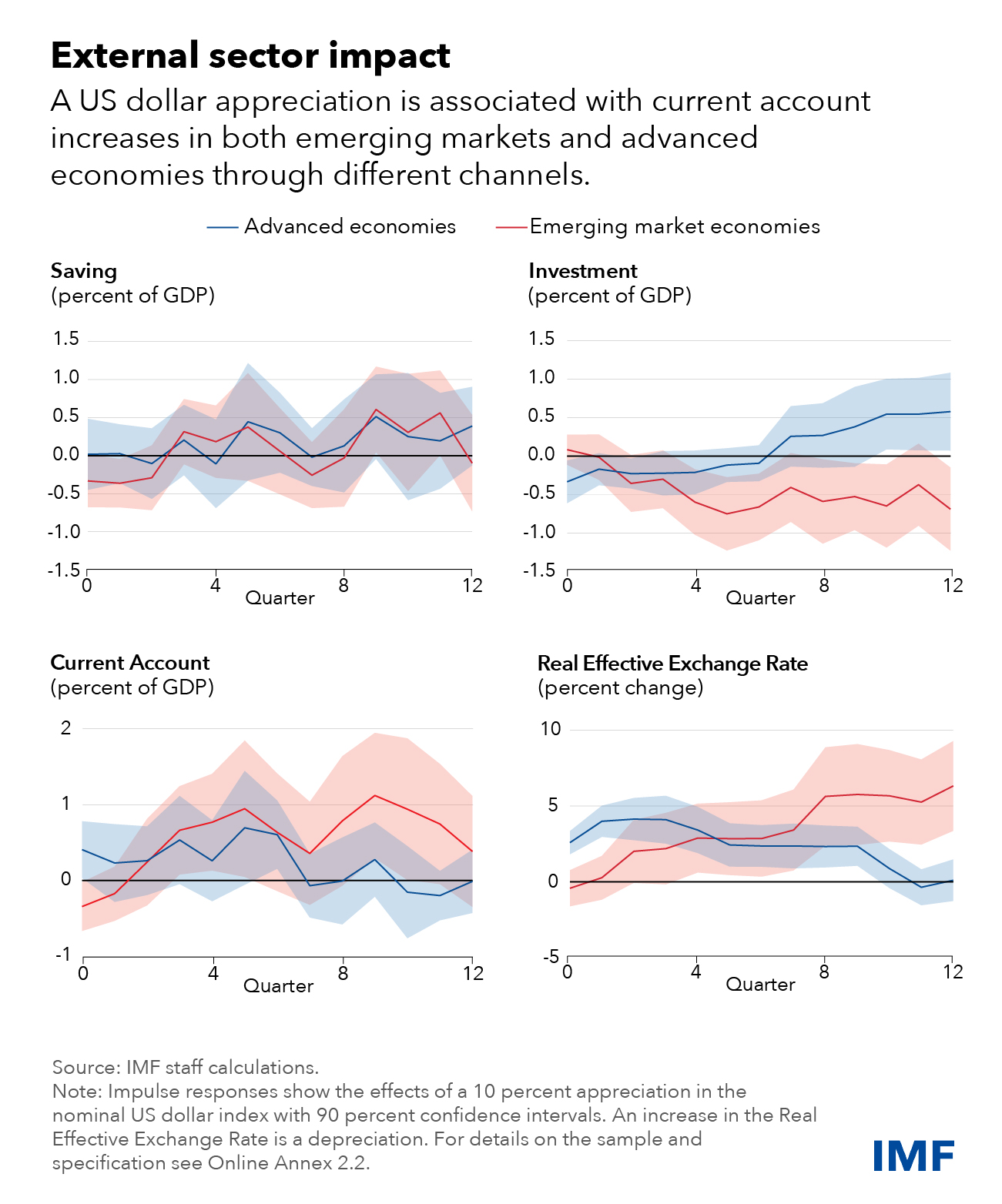 In addition, US dollar appreciations impact the current account, which captures the change in saving-investment balances of countries.