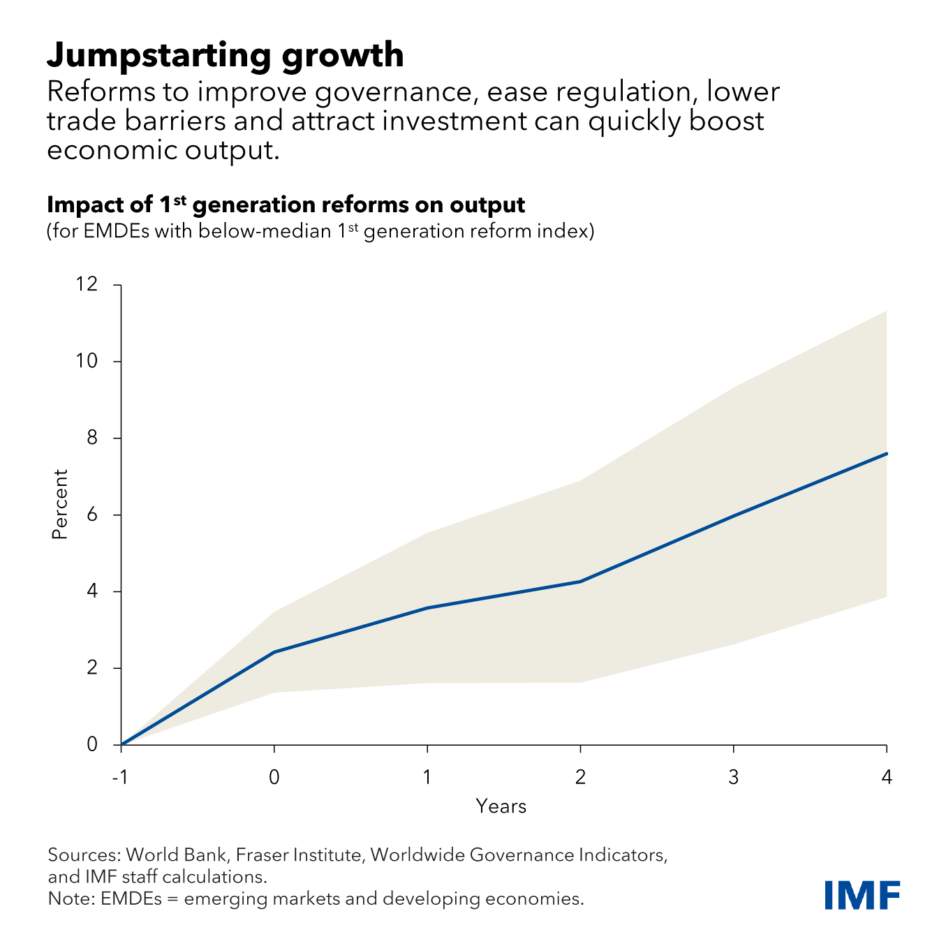 Our research shows that success hinges on how reforms are prioritized, sequenced, and bundled. Major changes addressing critical constraints to economic activity, such as reforms to improve governance and business regulation, and to reduce restrictions to trade and access to foreign capital, can deliver rapid output gains by promoting domestic and foreign investment and enhancing labor productivity. In economies with significant structural impediments, these so-called first-generation reforms can boost output levels by up to 4 percent in two years and up to 8 percent in four years.
