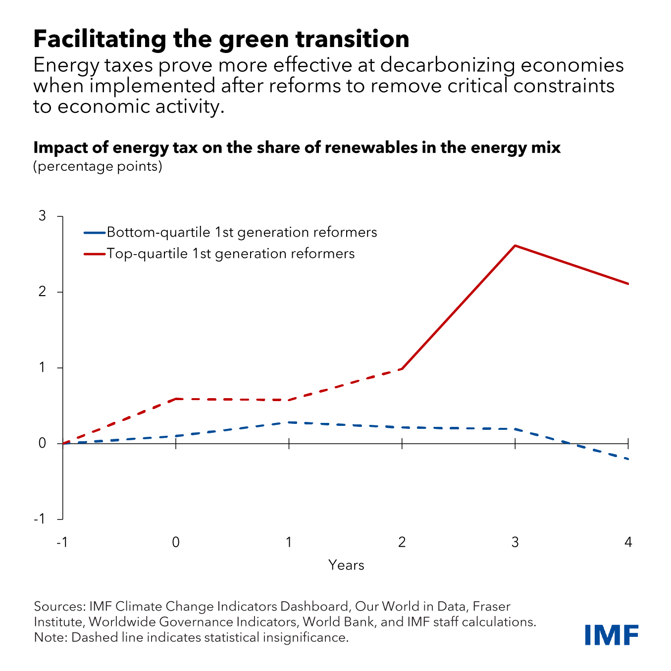 The first-generation reforms are essential to generate growth and thereby support the green transition but also for facilitating the shift to low-carbon activities. Our research indicates that green policies, especially energy taxation, better decarbonize economies after first-generation broad reforms that make the economy more responsive to price signals.