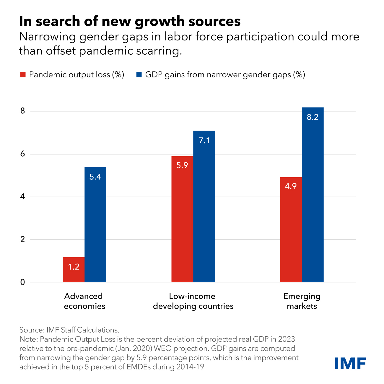 We estimate that emerging and developing economies could boost gross domestic product by about 8 percent over the next few years by raising the rate of female labor force participation by 5.9 percentage points—the average amount by which the top 5 percent of countries reduced the participation gap during 2014-19. As the Chart of the Week shows, that’s more than the economic “scarring,” or output losses, inflicted on countries by the pandemic.
