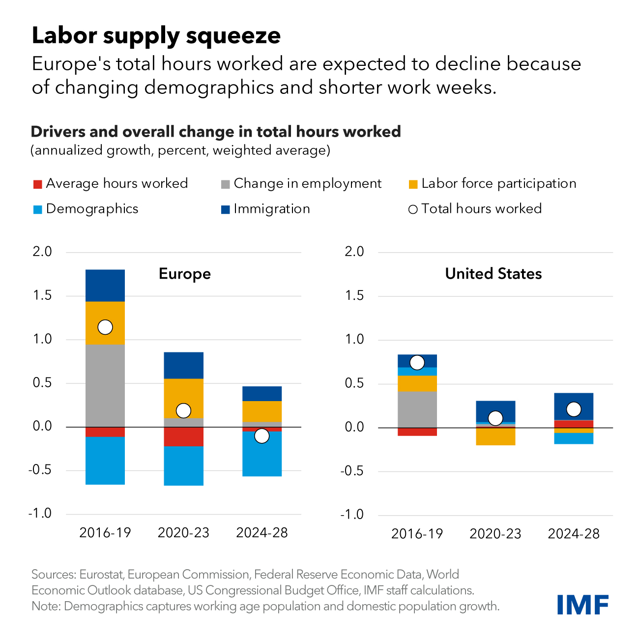 The scope to offset these labor market trends in Europe is limited. Proposals to increase retirement ages further may run into political opposition. There is also little scope to increase average working hours because shorter work weeks are gaining popularity.