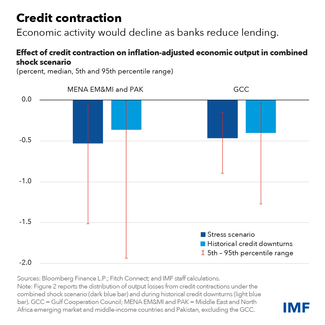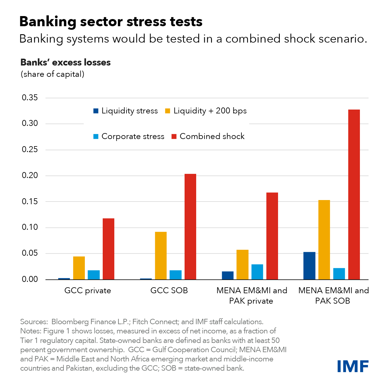 Few banks would breach minimum regulatory capital ratios in the combined shock scenario. Still, less capital would likely result in reduced lending to the private sector and a decline in economic activity, which is comparable to previous episodes of credit contraction. For example, the inflation-adjusted economic output loss in the combined shock scenario could be as high as 1.5 percent over two years. The estimated loss for the Gulf economies would be 0.9 percent.