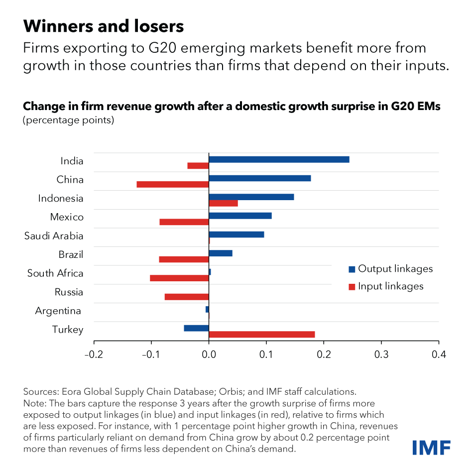 Growth spillovers from domestic shocks in G20 emerging markets have increased over the past two decades and are now comparable to those from advanced economies, as we detail in an analytical chapter of the April 2024 World Economic Outlook. We also examine how such shocks spread through trade to companies and industries in other countries.