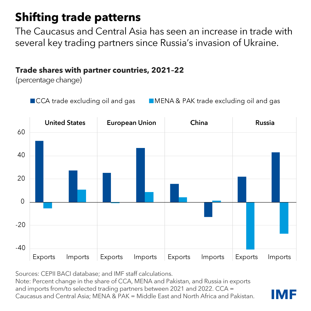 —This blog reflects contributions by Bronwen Brown and other staff across the Middle East and Central Asia Department. It is based on Chapter 3 of the April 2024 Regional Economic Outlook for the Middle East and Central Asia, “Trade Patterns amid Shocks and a Changing Geoeconomic Landscape.” The authors of the chapter are Apostolos Apostolou, Hasan Dudu, Filippo Gori, Alejandro Hajdenberg, Thomas Kroen, Fei Lui, and Salem Mohamed Nechi.