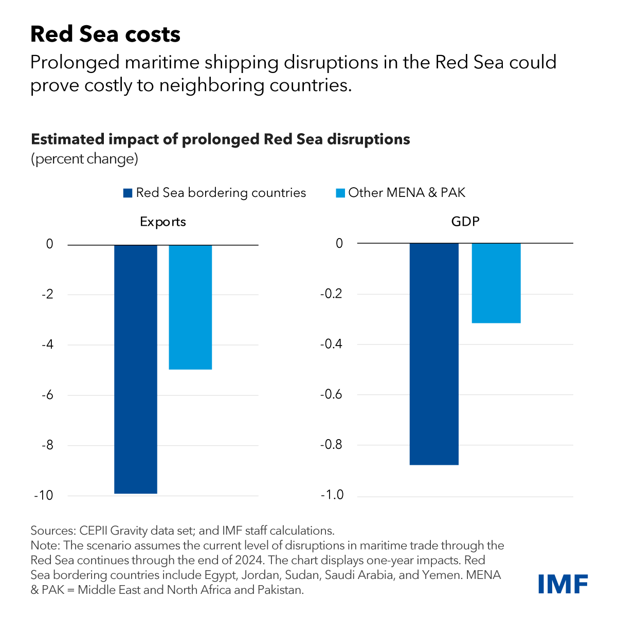 Persistent Red Sea disruptions could have sizable economic consequences for the most exposed economies. An illustrative scenario in our most recent Regional Economic Outlook shows that countries on the Red Sea (Egypt, Jordan, Saudi Arabia, Sudan, Yemen) could lose about 10 percent of their exports and close to 1 percent of GDP on average if disruptions continue through the end of this year.