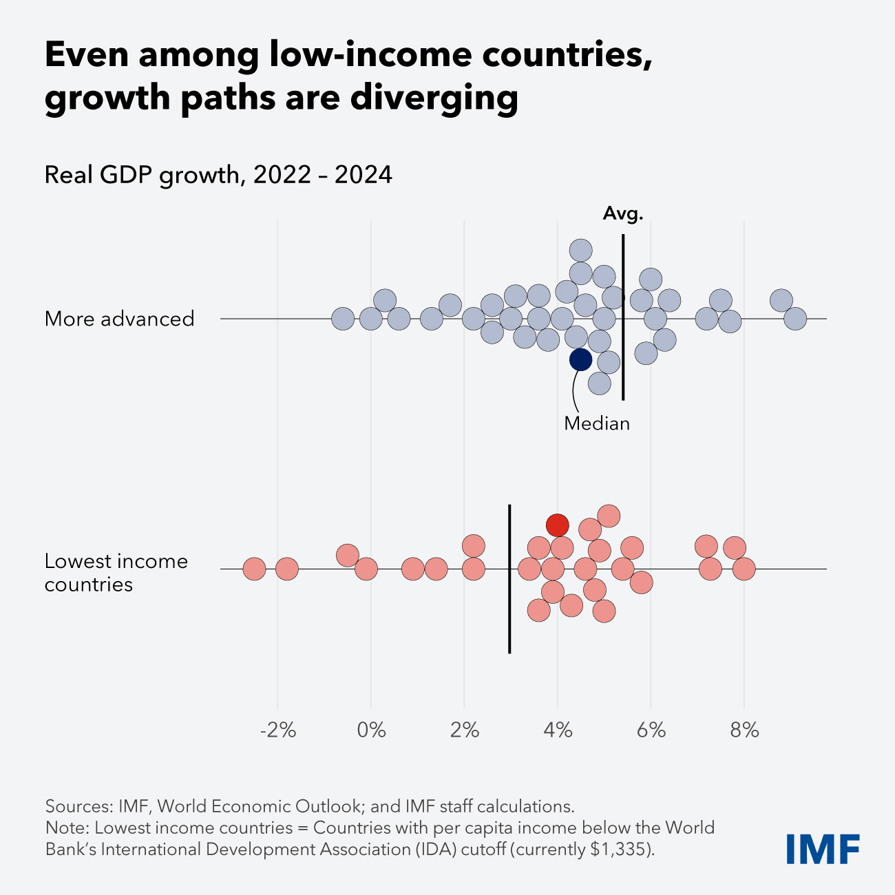 Among low-income countries, defined as the 70 countries eligible for IMF concessional lending (the Poverty Reduction and Growth Trust), 38 of the more advanced—with higher income, varied exports, and international capital market access—grew by an average of 5.3 percent from 2022-24. As the Chart of the Week shows, that compares with 3.3 percent in the poorest 32 in the group. It was just 2.6 percent for fragile and conflict states.