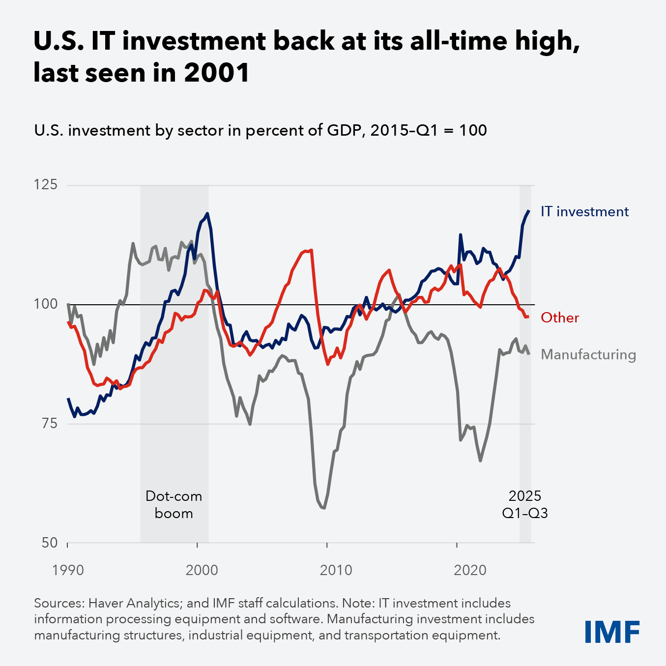 Another key driver of this resilience is the continued surge in investment in the information technology sector—especially in artificial intelligence. While manufacturing activity remains subdued, IT investment as a share of US economic output has surged to the highest level since 2001, providing a major boost to overall business investment and activity. Although this IT surge has been concentrated in the United States, it is also generating positive spillovers globally, most notably to Asia’s technology exports.