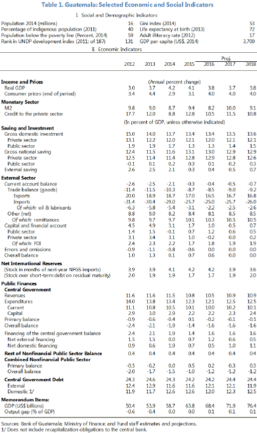 • Growth has remained robust. The Guatemalan economy has been growing slightly above potential and the output gap is closed. Growth remained at 4.1 percent in 2015 despite the slowdown in public consumption and investment during the political crisis. Private consumption was lifted by lower oil prices and strong remittances, while the unemployment rate remained at a low 3 percent.