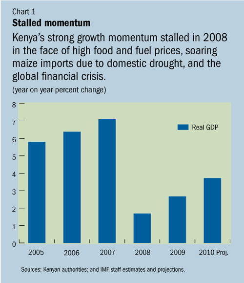 Kenya’s strong growth momentum during the 2004–07 period stalled in 2008 due to a series of adverse developments (see Chart 1). Recovery from post-election violence that had disrupted agricultural and manufacturing production was cut short by high fuel and food prices. In addition, high maize imports due to domestic drought weakened the external position.
