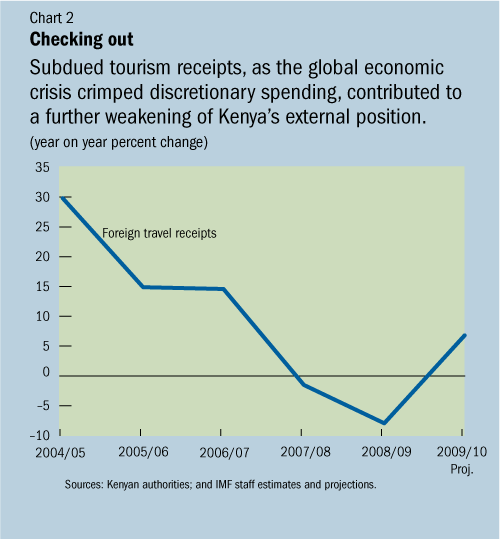 The global financial crisis led to steep decline in private capital flows, and subdued exports and tourism receipts (see Chart 2) all contributed to a further weakening of the external position. Official foreign exchange reserves fell by almost $800 million (about 20 percent of the stock of reserves) between mid-2008 and early 2009, increasing the country’s vulnerability to further shocks. On the capital market, there was substantial capital outflow from the Nairobi Stock Exchange, where the key share index declined by 35 percent in 2008 alone.