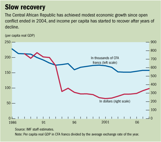 Maintaining economic stability. The Central African Republic is slowly recovering from the global economic crisis. Real GDP growth is projected to increase from 2 percent in 2009 to 3½ percent in 2010, and inflation is expected to slow to 2¼ percent after peaking at close to 15 percent at end-2008. World demand for the country’s principal exports—wood products and diamonds— declined significantly and may take time to pick up, but the current account balance is expected to improve in 2010 as aid flows rise. The tax-to-GDP ratio—still one of the lowest in the world—continues to head upward. However, insufficient resources, particularly grants, make it hard to implement a poverty reduction strategy.