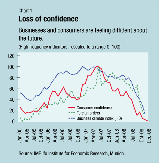 But since September 2008, the German economy has experienced a sharp drop in business confidence because of a steep decline in foreign orders (see Chart 1). "Exports are falling sharply, which is a particular setback to the German economy as it relies so heavily for its growth on exports," Mody said.