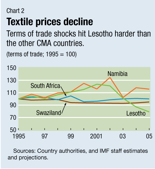 During the same period, declining prices of textile products—which accounted for over 75 percent of Lesotho's exports in 2005-06—have weakened its terms of trade. Namibia's terms of trade are heavily influenced by changes in the prices of diamonds and other minerals, and sugar prices are important for Swaziland.