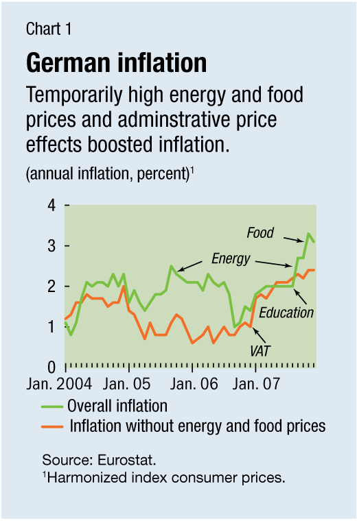 There are three reasons why inflation may begin to ease. First, administrative price increases will not be repeated in 2008. Second, the implementation effects of the VAT hike will no longer be felt, and, third, the euro appreciation and a slowdown of global and German growth may weaken demand and cause resource prices (energy and food) to decline. In total, these effects could lower the inflation rate by up to ½ of 1 percentage point.