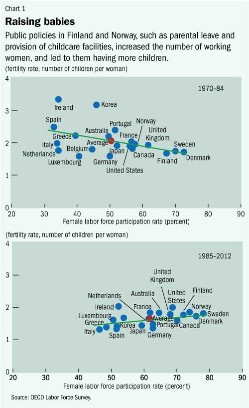 In contrast, Nordic countries have both high female labor force participation and fertility.