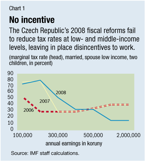 IMF staff has prepared a detailed evaluation of the package and discussed the findings with the Czech authorities. The analysis reveals several desirable features such as the shift from income to consumption taxation, making the tax system less distortionary to savings and investment.