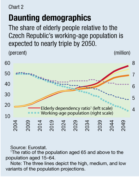 The Czech Republic faces one of the more daunting demographic challenges in the European Union, with the share of elderly people relative to the working-age population expected to nearly triple by 2050 (see Chart 2). Neverthless, the Czech Republic remains one of the few central and east European countries that has not reformed its public health and pension systems to ensure their viability.